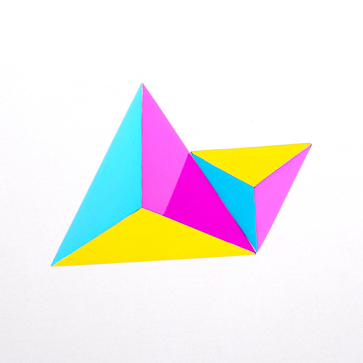 The Ignis CMY Tetrahedron is a beautiful polyhedron composed of four triangular faces, six straight edges, and four vertex corners. The Tetrahedron is the simplest of all the ordinary convex polyhedra and the only one that has fewer than 5 faces. It is one of the 5 Platonic solids.